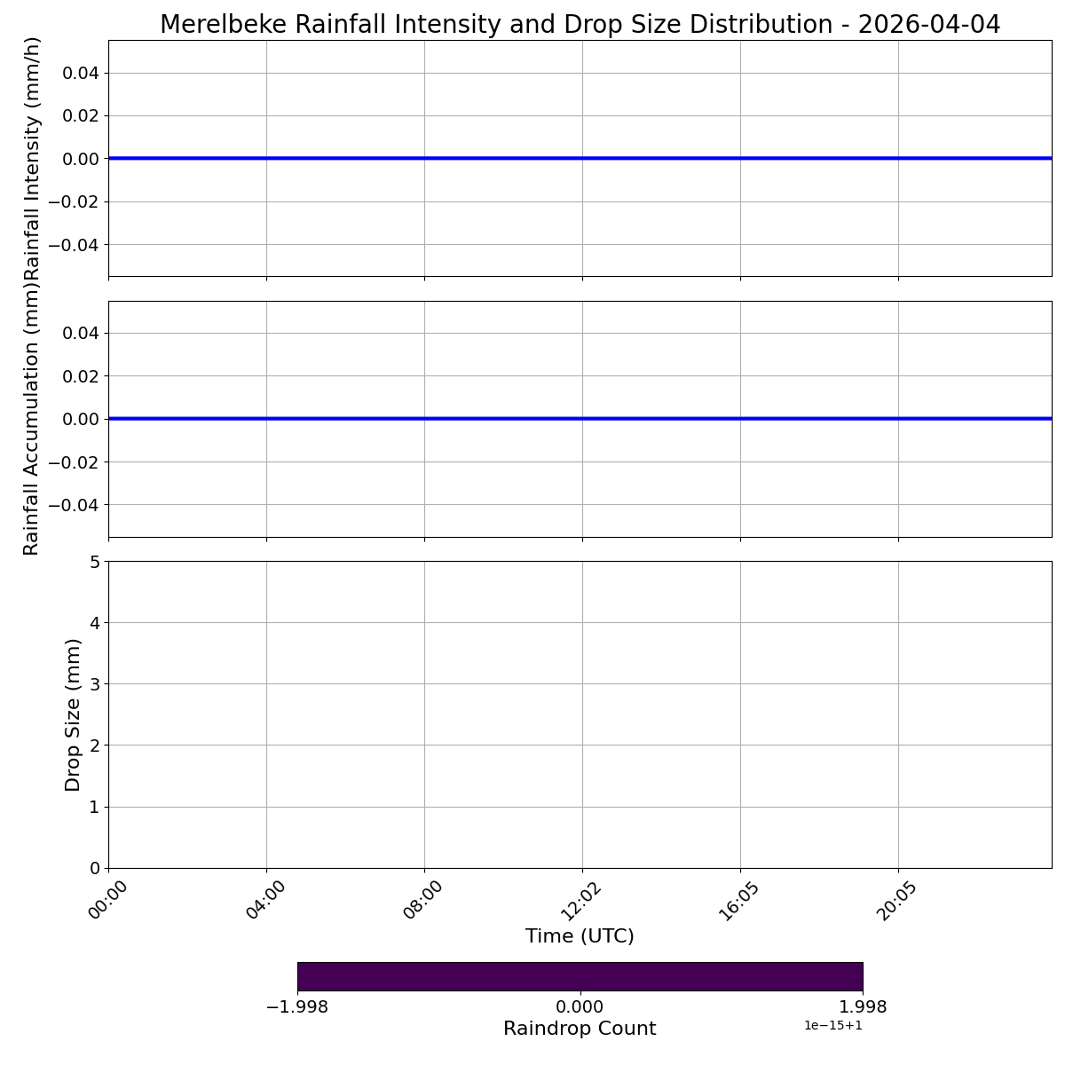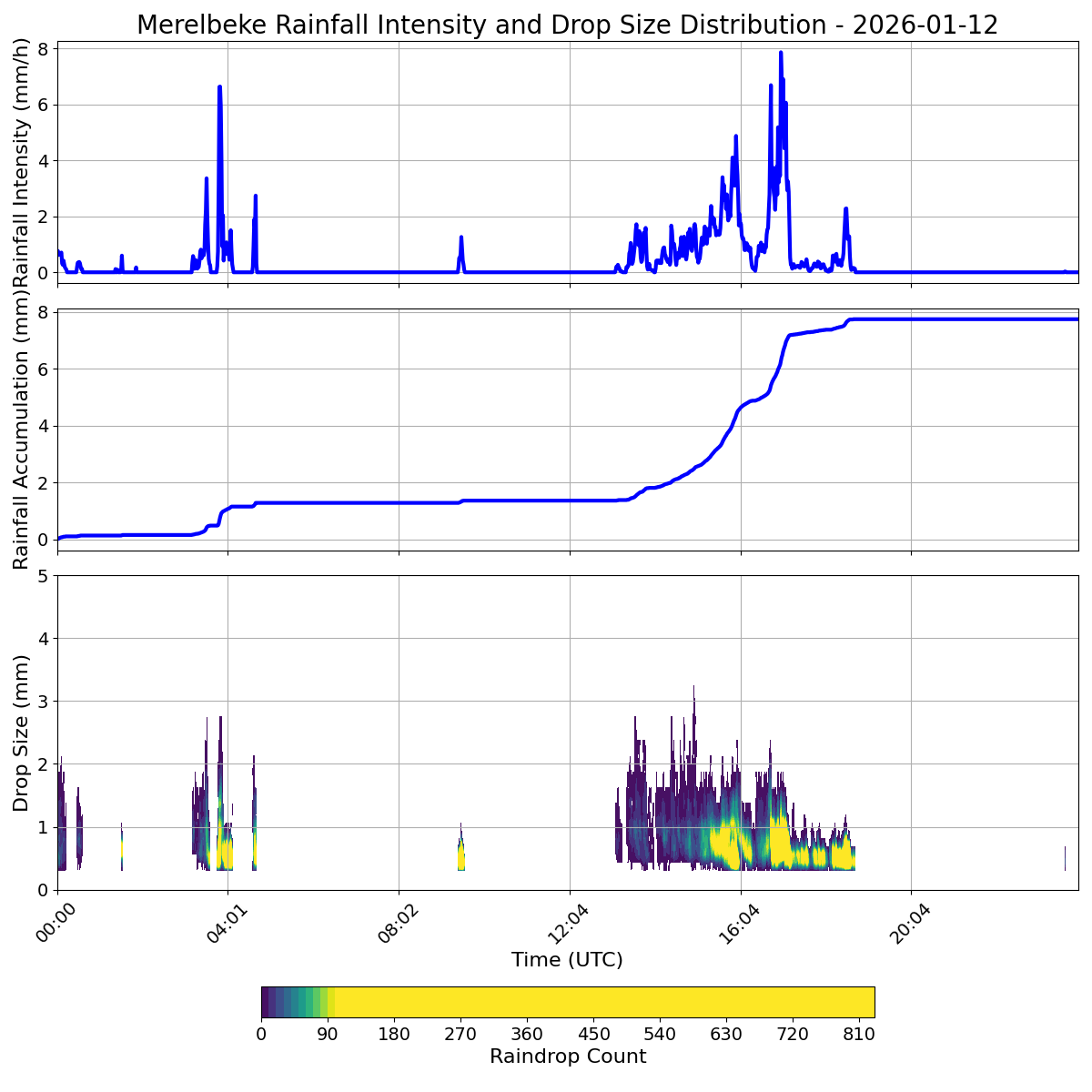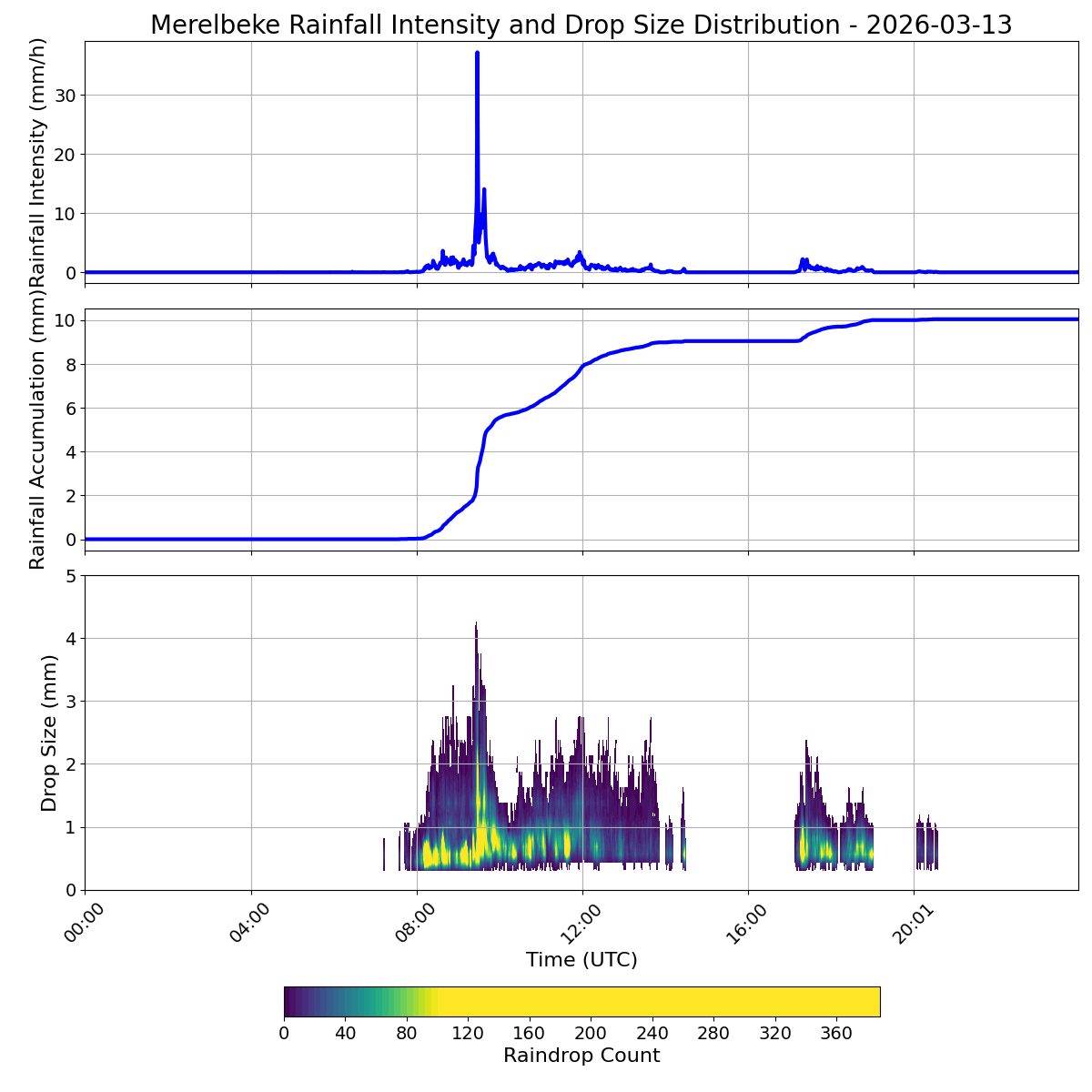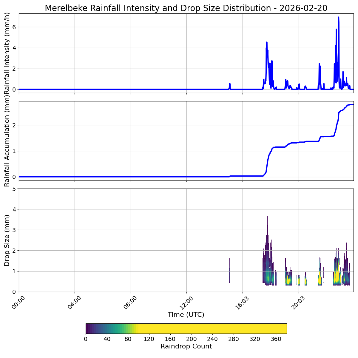 The "Climate & Earth" team's disdrometer setup and processing backend produces daily updated graphs of precipitation measurements from the disdrometer and rain gauge at ILVO, Merelbeke.