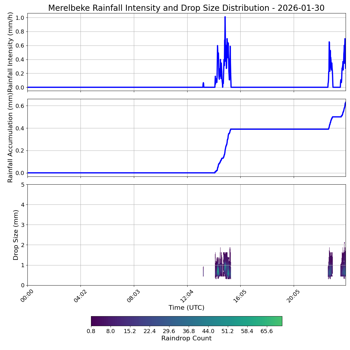 The "Climate & Earth" team's disdrometer setup and processing backend produces daily updated graphs of precipitation measurements from the disdrometer and rain gauge at ILVO, Merelbeke.